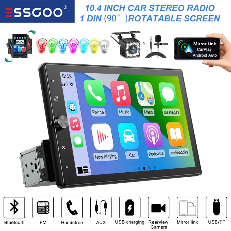 ESSGOO 10.4" WINCE 1 DIN Car Stereo Radio Wireless Apple Carplay 90°Rotatable IPS Screen Android Auto FM USB AUX Bluetooth SWC