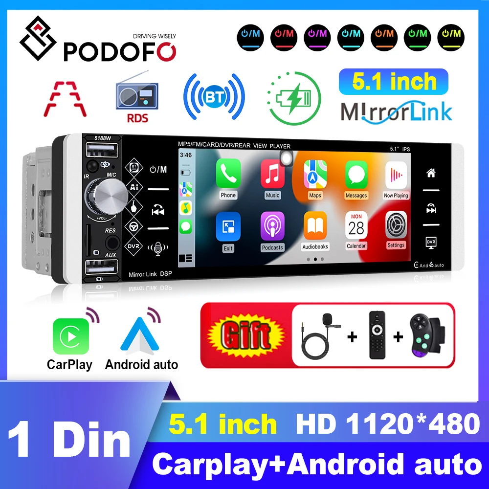 Podofo 1din Carplay Car Radio 5.1 Inch MP5 Audio Video Player Android auto Carplay Bluetooth Receiver AM FM Radio Tape Recorder